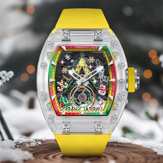 CRONUSART Tonneau Mechanical Acrylic Case Luminous Fluororubber Strap Wristwatch